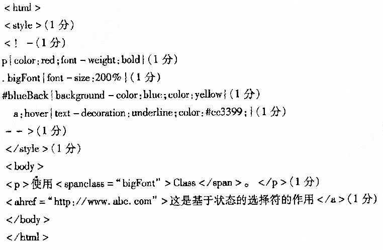 (1)利用样式单显示“使用Class”。内容,其中Class的颜色为“蓝色”,bigFont类为“200%”;