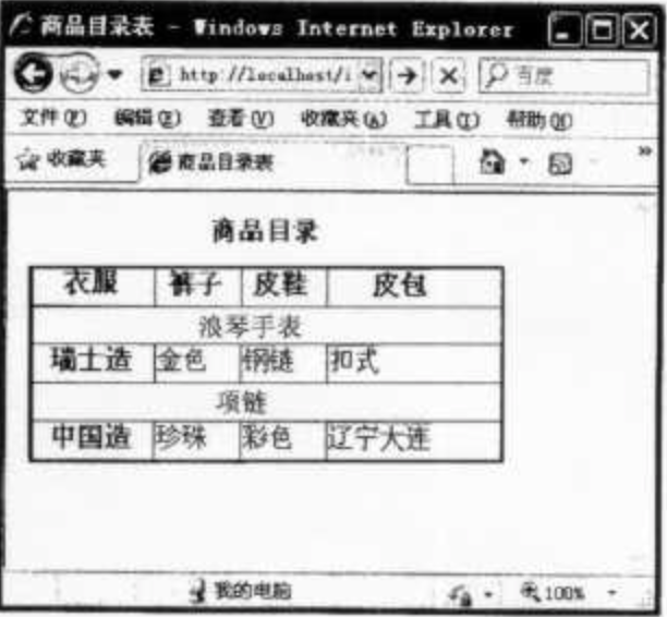 (4)表格内容中:“衣服”、“裤子”、“皮鞋”、“皮包”、“浪琴手表”、“瑞士造”、“项链”、“中国造”是表格的标题行,其余为单元格,单元格内容为“金色”、“钢链”、“扣式”、“珍珠”、“彩色”、“辽宁大连”;