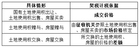本题可从“国有土地使用权出让”入手。契税的计税依据分以下几种情形: