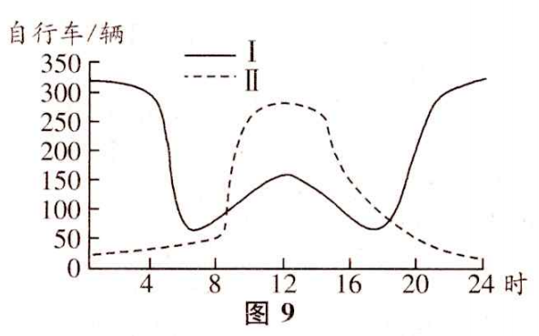 某城市试点共享单车和共享汽车服务。其中,共享汽车是纯电动汽车,市民利用手机小程序就能快速订车使用。图9示意该城市某工作日不同区域共享单车的停车数量变化。据此完成39〜40题。