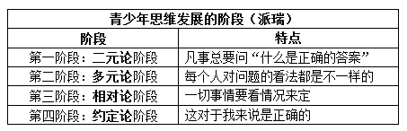 美国心理学家派瑞通过对青少年思维过程的研究,提出青少年思维发展需要经过四个阶段才能逐渐成熟。这四个阶段的正确发展顺序是
