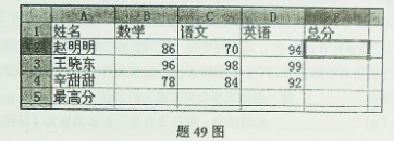 在Excel2010中,有题49图所示的工作表数据,“总分”列用于计算每个人的总分,“最高分”行用于计算每门课的最高分。分别写出利用函数在E2单元格计算总分和B5单元格计算最高分的公式。
