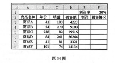 在 Excel2010中,已知某公司商品销售数据如题54图所示。写出完成下列要求所需的公式(1)在E3单元格中计算“商品A”的利 作者:高老师 时间:2024-07-21 浏览 0 在 Excel2010中,已知某公司商品销售数据如题54图所示。写出完成下列要求所需的公式(1)在E3单元格中计算“商品A”的利润(2)在F3单元格中判断“商品A”的销售情况(条件为该商品销量大于100,则结果为“畅销”,否则结果为“滞销”)【正确答案】:(1)在E3单元格中输入:=D3*0.2 (2)在F3单元格输入:=if(c3>100,"畅销","滞销") 📱 扫码体验刷题小程序 扫一扫使用我们的微信小程序