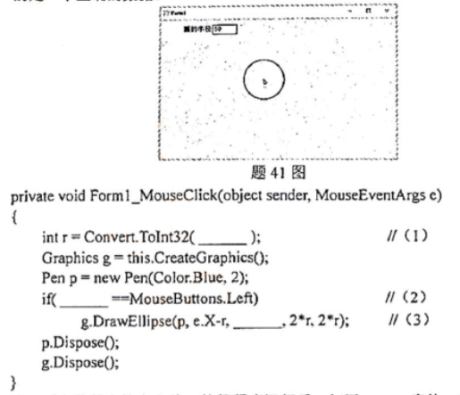 在Form1窗体中,有一个名称为rd的文本框将下列的事件程序补充完整,使得程序运行后,在Form窗体中单击鼠标左键时,在窗体中以单击点处为中心,rd文本框中数值为半径,画一个圆,效果如题41图所示。系统保证rd文本框中输入的是一个正确的数据。