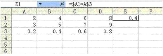在Excel工作表中有如图所示的数据,在E1单元格中输入公式“=$A1*A$3”后,将公式复制到F2单元格,该单元格的值是()。