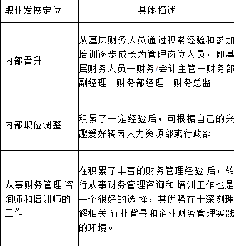 (2)管理发展路径:助理会计师/财务专员/审计专员/财务分析员/财务预算员/财务结算员→财务主管→财务部经理→财务总监→总经理。(P332)