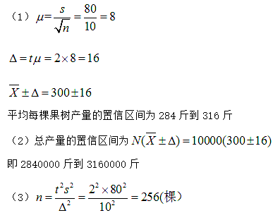 一果园有某种果树10000棵,重复抽取其中100棵进行采摘,测得平均每棵果树产量为300斤,标准差80斤,试在95.45%的置信 作者:高老师 时间:2024-07-21 浏览 0 一果园有某种果树10000棵,重复抽取其中100棵进行采摘,测得平均每棵果树产量为300斤,标准差80斤,试在95.45%的置信概率(t=2)下,计算并回答下列问题:(1)平均每棵果树产量的置信区间;(2)10000棵果树总产量的置信区间;(3)若要求极限误差在10斤之内,求应至少抽取多少棵果树?【正确答案】: 📱 扫码体验刷题小程序 扫一扫使用我们的微信小程序
