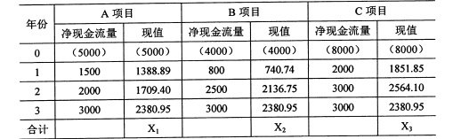 假设当前资本成本率为8%。乙企业现有A、B、C三个投资项目,其初始投资分别为5000万元、4000万元和8000万元,三个项目各年的净现金流量及现值的数据如下表所示(表内使用括号的数字为负数,单位:万元)