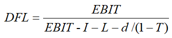 式中,DFL为财务杠杆系数;EBIT为息税前利润;I为债券或借款利息;L为租赁费;d为优先股股利;T为所得税税率。