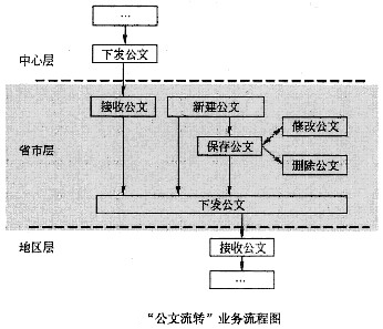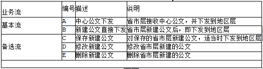 图1-1描述了简化的中心层、省市层、地区层三级的“公文流转”业务流程,表1-1描述了省市层(图1-1阴影部分)业务的基本流和备选流。