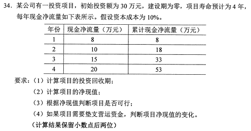 作者:高老师 时间:2024-07-22 浏览 1 【正确答案】:(1)投资回收期=2+(30-18)÷15=2.8(年)(2)净现值=8×0.9091+10×0.8264+15×0.7513+20×0.6830-30=10.47(万元)(3)净现值大于零,项目可行(4)如果项目需要垫支营运资金,净现值将会降低。 📱 扫码体验刷题小程序 扫一扫使用我们的微信小程序