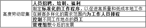 人员招聘、培训和福利;制定标准化的工作程序;在顾客多样化的需求范围内为工作人员排程;人员管理;组织管理