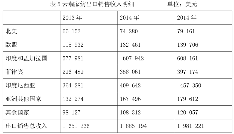 在国内市场,云斓家纺将产品直接销售给成品加工厂。公司的销售团队有4名成员,负责对50多家客户的销售。另外,公司还参加家纺产品的展销会,借此吸引海内外的潜在客户。在海外市场,云斓家纺通过当地代理商向多个国家岀口产品,其中最大的出口市场是印度和孟加拉国。公司在出口市场的销售收入逐年增长,销售数据详见表4和表5。