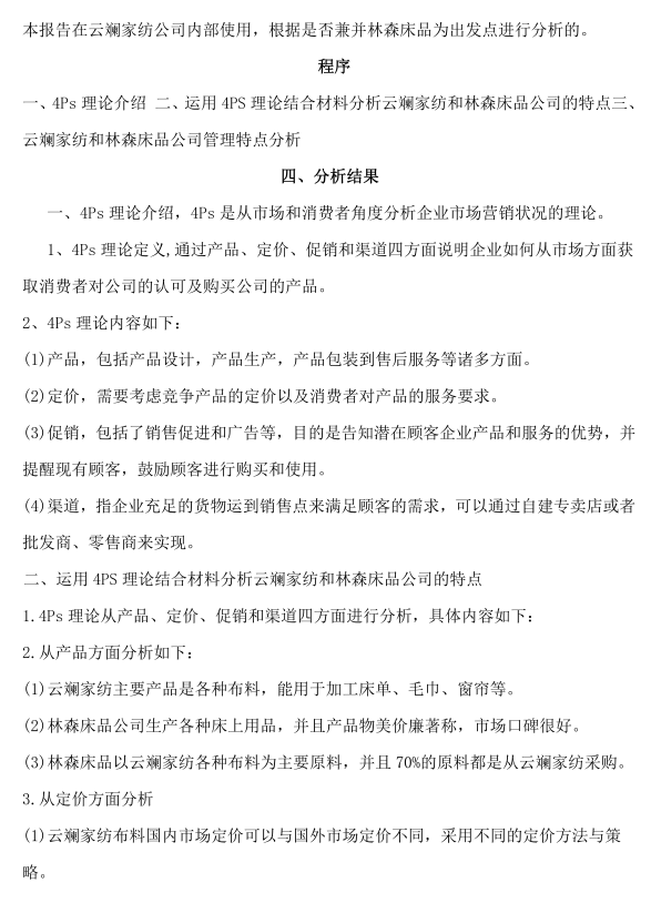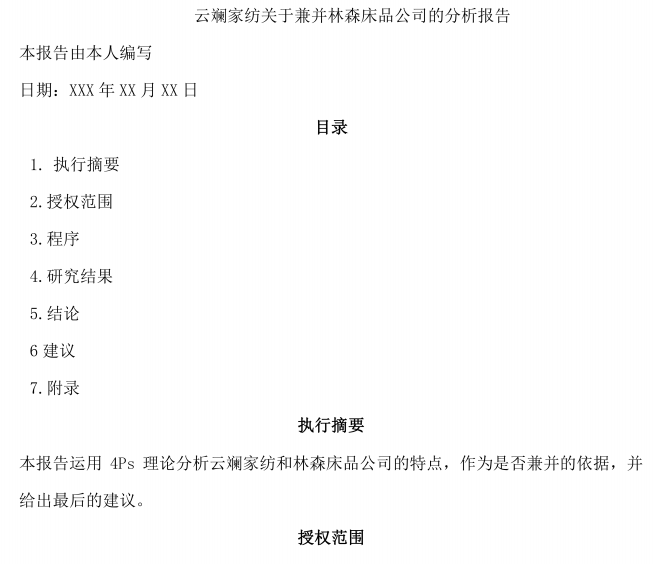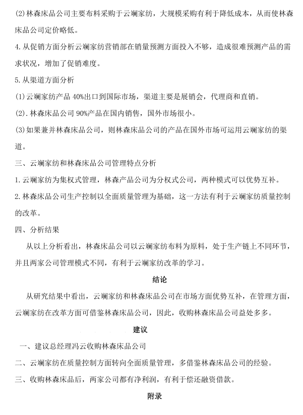 二、云斓家纺总经理冯云写一份报告,通过分析云斓家纺和林森床品公司的特点,对要不要兼并林森床品公司提出建议。