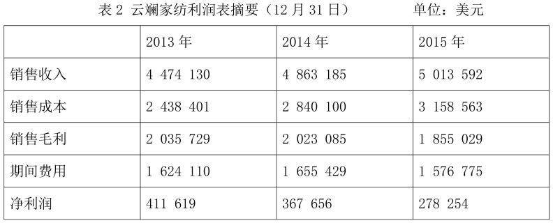 (1)云斓家纺目前采用分集权管理模式能促使销售收入不断增加,公司还具有一定的净利润,从表2云斓家纺利润表摘要可以看出来