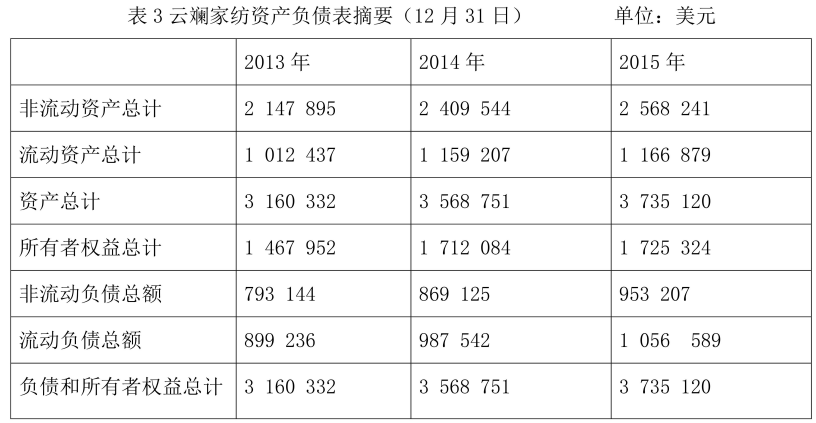 (2)云斓家纺目前的管理模式能促使企业模式不断扩大,所有者权益不断增多,从表3云斓家纺资产负债表可以看出来