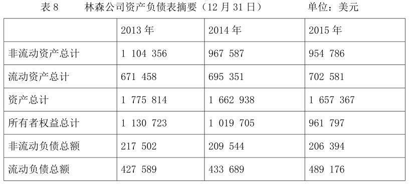 这项收购是以2000000美元的价格购买林森公司100%的股权。表7和表8汇总了林森公司近三年财务报表中的部分数据。