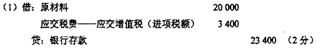 丙公司为增值税一般纳税人,存货核算采用实际成本法。2011年3月份发生的有关经济业务如下: (1)购入原材料一批,取得增值税专用发票上注明的价款为20000元,增值税税额为3400元,原材料验收入库,款项以银行存款支付; (2)购入不需安装的生产设备一台,取得增值税专用发票上注明的价款为50000元,增值税税额为8500元,设备交付使用,款项以银行存款支付; (3)销售产品一批,不含税售价为100000元,增值税税额为17000元,款项存入银行; (4)销售库存积压材料一批,不含税售价为2000元,增值税税额为340元,款项存入银行: (5)以银行存款交纳本月增值税额5440元。 要求: (1)编制购入原材料的会计分录; (2)编制购入生产设备的会计分录; (3)编制销售产品的会计分录; (4)编制销售积压材料的会计分录; (5)编制交纳本月增值税的会计分录。 (“应交税费”科目要求写明细科目及专栏名称)
