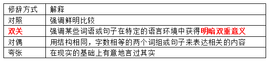 某理发店广告语“谁说毫末技艺,却是顶上工夫”运用的修辞方式是( ) 作者:高老师 时间:2024-07-23 浏览 2 某理发店广告语“谁说毫末技艺,却是顶上工夫”运用的修辞方式是( )A、对照B、对偶C、夸张D、双关【正确答案】:D【题目解析】:文中的"顶上功夫"指理发技术,同时又是指超高本领;所以是双关。 📱 扫码体验刷题小程序 扫一扫使用我们的微信小程序