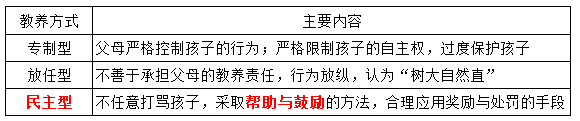 父母对孩子的行为更多的是欣赏协助和引导,对于孩子在成长或学习过程中发生的问题更多的是采取帮助与鼓励的方法,并合理地担当起监护人的 作者:高老师 时间:2024-10-09 浏览 0 父母对孩子的行为更多的是欣赏协助和引导,对于孩子在成长或学习过程中发生的问题更多的是采取帮助与鼓励的方法,并合理地担当起监护人的责任,这种教养方式属于( )A、专制型B、放任型C、民主型D、情动型【正确答案】:C【题目解析】:情动型母亲培养出的孩子,喜欢抛头露面,与人交往胆大妄为;排除D综上可得,本题的正确答案为C项。 📱 扫码体验刷题小程序 扫一扫使用我们的微信小程序