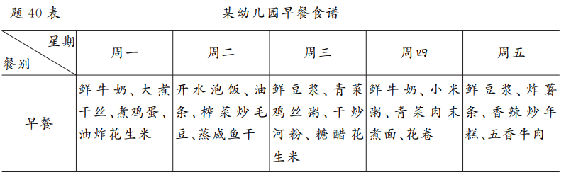 案例:题40表是某幼儿园早餐食谱。经计算,其周一、周二早餐热量占全天总热量18%,周三至周五早餐热量占全天总热量的25%。