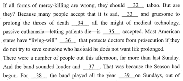 【正确答案】:32.Q.remain的意思是“保持、保留”。remain taboo也就是继续保留在被禁止的范围中。该句的意思是“如果所有形式的安乐死都是错误的,那就应该统统列入禁止之列。”33.M.undignified的意思是“没有尊严的”。该句的意思是“许多人都认为依靠医学技术来延续生命带给人的痛苦是令人悲哀、完全不顾人的尊严,令人生畏的”34.K.with这里表示“使用”,即“用各种可能的医疗技术来延续生命”35.Y.widely的意思是“广泛地”。文中的widely accepted表示“普遍接受”。36.V.legislation的意思是“法律、法规”。原文的意思是“美国大多数州都有关于‘活遗嘱’的法规”。37.B.gayer的意思是“更快乐,更欢快”。原句是指“乐队演奏得更加响亮,更加欢快”。38.W.although表示“尽管”。原文的意思是“尽管乐队每逢星期日都演奏,但不是演出季节时总是不太一样。”39.H.round。这里all year round的意思是“全年,一年到头”。40.I.season。这里out of season指的是“淡季”。例如Oysters are out of season now.(牡蛎已经下市了。)文中是指“尽管乐队每逢星期日都演奏,但不是演出季节时(也就是在淡季演出)总是不太一样。”41.O.listen“听”。原句是指“就好像一个人只演奏给家里人听那样。”42.D.restless的意思是“难以入睡的”。原文的意思是“只要我躺在床上有一两个小时睡不着,我就能令自己满意地解决人类的一切疑虑。”43.S.to。这里的“to my own satisfaction”表示“让我自己满意,达到我自己的满意程度”。44.X.compose“创作”。这里的“compose grand symphonies”意思是“谱写出宏伟的交响乐”。45.G.magnificent意思是“壮丽的”。这里的“paint magnificent pictures”意思是“描绘出壮丽的画卷”。46.E.for,这里表示“因为”。原句的意思是“这一切仍无法令我满意,因为我还是无法入睡。”47.R.dispatches意思是“派遣”。原句的意思是“刊登通讯社的电讯稿比派记者到现场采访要容易。”48.N.dictate意思是“控制”。原句“let the ads dictate the format”的意思是“任由广告左右版面”。49.C.above意思是“在……上面”。文中“elevate news above dogfood”表示“使新闻比狗食广告地位更为突出”。50.P.editorial意思是“编辑的”。文中的“to write editorial copy”是指“写社论稿”。51.L.rather。这里rather than的意思是“与其……倒不如……”。原文指的是“写社论稿时,与其诉诸于理智倒不如诉诸于情感。”52.T.motive意思是“动机”。原文的意思是“虚荣心是一个有着极大潜力的动机。”53.J.much意思是“许多”。have much to do with表示“和……有着很大的关系”。原文是指“常与孩子们打交道的人”54.A.constantly意思是“时常地”。原文是指“他们经常做个什么怪动作,然后说‘快看我’。”55.F.innumerable意思是“无数的”。原文中的“innumerable forms”指的是“无数的表现形式”。56.U. buffoonery意思是“打诨,滑稽”。原文的意思是“虚荣心可以有无数表现形式,从插科打挥到追求死后的名声。”