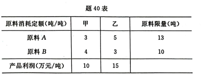 某公司利用两种原料A、B生产甲、乙两种产品(吨),单位产品所需的原料数、原料限量及单位产品所获利润如题40表。企业日标是追求利润的最大化,试写出该线性规划问题的数学模型,并用图解法求出最优解和最大利润。