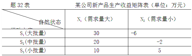 某公司拟对新产品生产批量作出决策,现有三种备选方案,未来市场对该产品的需求有两种可能的自然状态,收益矩阵如题32表。以最大最大决策标准作出最优生产决策。