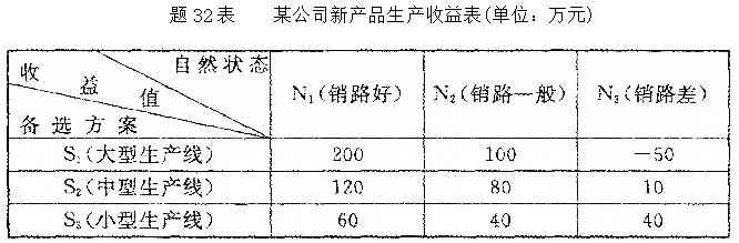 某公司拟对新产品生产批量作出决策,现有三种备选方案,未来市场对该产品的需求也有三种可熊的自然状态,收益如题32表。