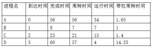 平均周转时间=(56+7+21+57)/4=35.25;平均带权周转时间=(56/34+7/7+21/15+57/4)/4=4.57