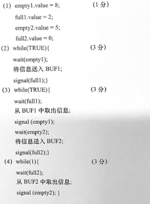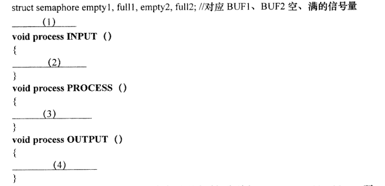 系统中有三个进程 INPUT、 PROCESS和 OUTPUT,共用两个缓冲区UF1和BUF2假设BUF1中最多可放10个数据,现已放入了2个数据;BUF2最多可放5个数据。 INPUT进程负责不断地将输入的原始数据送入BF中, PROCESS进程负责从BUF1中取出原始数据进行处理,并将处理后的结果数据送到BF2中,OUTPUT进程负责从BUF2中读取结果数据并输出。请采用记录型信号量机制,实现进程 INPUT、 PROCESS和 OUTPUT的同步算法。补充完成下列带标号处空缺的内容。(注:空缺处可能有多行代码)