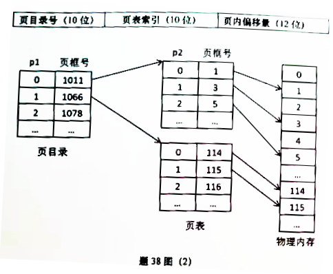(2)若使用两级页表的分页存储管理方式,逻辑地址结构及相关数据(十进制)如题38图(2)所示。设有一逻辑地址0x00401232,请计算对应的页目录号、页号、进程页所在的页框号、页内偏移以及物理地址。