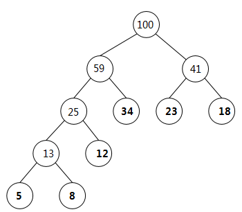 (3)从F中删去5、8,并将13加入F。此时F= {34, 13, 12, 23, 18}。此时F中仍多于一棵二叉树,则返回(2)。F的变化过程为{34,25, 23, 18},{34,25,41},{59,41},{100}。直到F中只含一棵二叉树为止,这棵二叉树就是哈夫曼树。