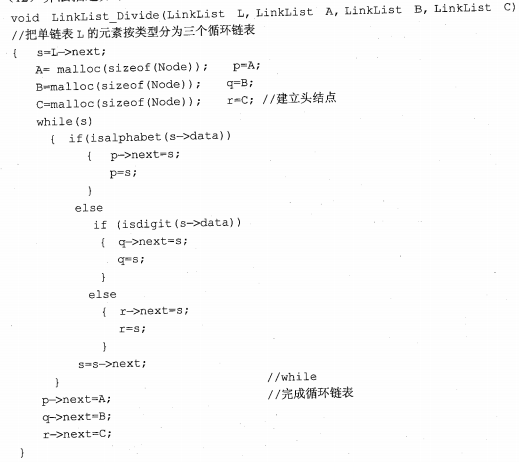 已知一单链表中的数据元素含有三类字符(即字母字符、数字字符和其他字符)。试编写算法,构造三个单循环链表,使每个循环链表中只含同一类的字符,且利用原表中的结点空间作为这三个表的结点空间(头结点可另辟空间)。