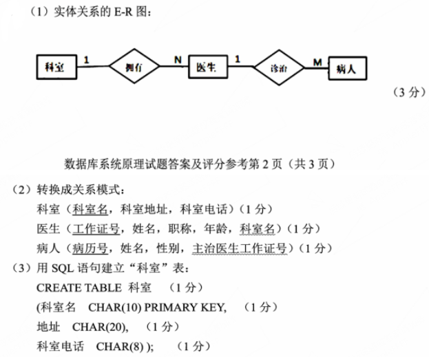 其中:一个科室有多名医生,一个医生只能属于一个科室,但可负责多个病人的诊治,一个病人的主治医生只有一个。
