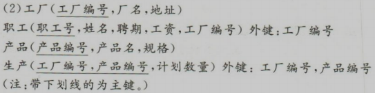 某企业集团有若干工厂,每个工厂生产多种产品,且每一种产品可以在多个工厂生产,每个工厂按照固定的计划数量生产产品;每个工厂聘用多名 作者:高老师 时间:2024-07-27 浏览 1 某企业集团有若干工厂,每个工厂生产多种产品,且每一种产品可以在多个工厂生产,每个工厂按照固定的计划数量生产产品;每个工厂聘用多名职工,且每名职工只能在一个工厂工作,工厂聘用职工有聘期和工资。工厂的属性有工厂编号、厂名、地址,产品的属性有产品编号、产品名、规格,职工的属性有职工号、姓名。(1)根据上述语义画出E-R图,在E-R图中需注明实体的属性、联系的类型及实体的标识符。(2)将E-R模型转换成关系模型,并指出每个关系模式的主键和外键。【正确答案】:答:(1) 📱 扫码体验刷题小程序 扫一扫使用我们的微信小程序