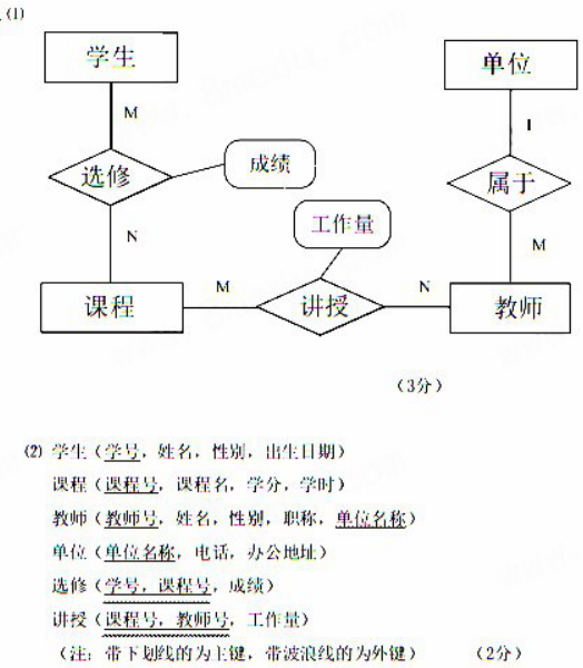 设有如下实体: 学生:学号,姓名,性别,出生日期 课程:课程号,课程名,学分,学时 教师:教师号,姓名,性别,职称 单位:单位名称,电话,办公地址 其中,一个学生可选修多门课程,一门课程可被多个学生选修,学生选学课程后要记录考试成绩;一个教师可讲授多门课程,一门课程可由多个教师讲授,教师讲授一门课程要记录教师的工作量;一个单位有多个教师,一个教师只能属于一个单位。 (1)试画出反映上述实体关系的E-R图。(不必画实体的属性) (2)转换成关系模式,并指出每个关系模式的主码和外码(如果有外码指出来),在主码下画直线 ,在外码下画波浪线 。