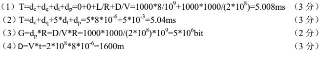主机A和主机B由一条带宽R=1Gbit/s、 长度D=1000km的链路互连,在t=0时刻,主机A通过该链路向主机B连续发送了 作者:高老师 时间:2024-07-27 浏览 0 主机A和主机B由一条带宽R=1Gbit/s、 长度D=1000km的链路互连,在t=0时刻,主机A通过该链路向主机B连续发送了10个长度L=1000B的分组,信号传播速度V=2*108m/s,忽略节点处理延迟。求:(1)第一个分组从主机A到主机B的时延(单位为ms)。(2)第五个分组从主机A到主机B的时延(单位为ms)。(3)链路的时延带宽积。(4)t=8μs时刻,第一个分组的第一位与主机A的距离(单位为m)。(5)10个分组全部发送完毕后,接 收 端 只 收到7个分组时的丢包率。【正确答案】:(5)ƞ=(10-7)/10=30% 📱 扫码体验刷题小程序 扫一扫使用我们的微信小程序