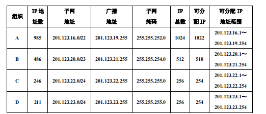 设某ISP拥有一个网络地址块201.123.16.0/21,现在该ISP要为A、B、C、D四个组织分配IP地址,其需要的地址数量分别为985、486、246以及211,而且要求将低地址段的P地址分配给P地址需求量大的组织。请给出一个合理的分配方案以满足该需求。要求将各组织所获得的子网地址、广播地址、子网掩码、地址总数、可分配P地址数和可分配P地址范围参照题44表(样表)绘表填写。