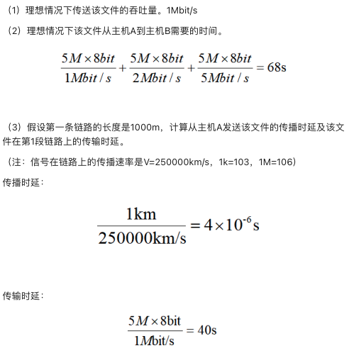 假设主机A向主机B以存储转发的分组交换方式发送了1个大小为5MB的文件,而且网络中没有其他流量。主机A到达主机B只有一条由3段链 作者:高老师 时间:2024-07-27 浏览 0 假设主机A向主机B以存储转发的分组交换方式发送了1个大小为5MB的文件,而且网络中没有其他流量。主机A到达主机B只有一条由3段链路组成的路径,3段链路的速率分别是R1=1Mbit/s,R2=5Mbit/s,r3=2Mbit。试完成如下计算(要求写出计算过程):(1)理想情况下传送该文件的吞吐量。(2)理想情况下该文件从主机A到达主机B需要的时间。(3)假设第1段链路的长度是1000m,计算从主机A发送该文件的传播时延及该文件在第1段链路上的传输时延。(注:信号在链路上的传播速率V=250000km/s,1k=103,1M=106【正确答案】: 📱 扫码体验刷题小程序 扫一扫使用我们的微信小程序