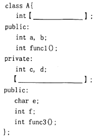 补全关于类A的声明,使其有公有成员变量a、b、e和f,公有成员函数func1()和func3(),私有成员变量m、n、c和d,私有成员字符型函数func2()。
