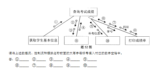 某教务管理系统软件中查询期末考试成绩部分的模块结构图如题52图所示。模块之间未标明的数据流和控制流如下:A.学号B.姓名C. 科目D.成绩E.补考信息F.及格G. 不及格其中未填充的2个模块名如下:H.打印补考通知单K.查询成绩