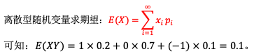 XY的取值有:1,0,-1,P{XY=1}=P{X=1,Y=1}=0.2P{XY=0}=P{X=0,Y=-1}+P{X=0,Y=0}+P{X=0,Y=1}+P{X=1,Y=0}=0.7P{XY=-1}=P{X=1,Y=-1}=0.1