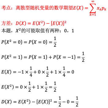 D(X) 作者:高老师 时间:2024-07-28 浏览 1 ,试求:D(X)【正确答案】:E(X)=-1×1/4+0×1/2+1×1/4=0D(X)=E(X^2)-(EX)^2=1×1/4+0×1/2+1×1/4-0^2=1/2【题目解析】: 📱 扫码体验刷题小程序 扫一扫使用我们的微信小程序