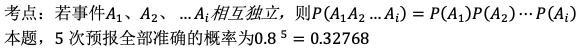作者:高老师 时间:2024-07-28 浏览 1 某气象站天气预报的准确率为0.8,且各次预报之间相互独立。试求:【正确答案】:P=(0.8)^5=0.32768【题目解析】: 📱 扫码体验刷题小程序 扫一扫使用我们的微信小程序