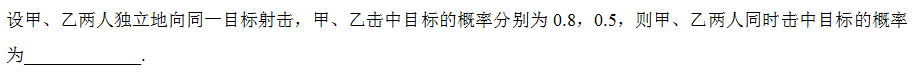 作者:高老师 时间:2024-07-28 浏览 2 【正确答案】:0.4【题目解析】:设A,B分别表示甲、乙两人击中目标的两事件,已知A,B相互独立,则 P(AB)=P(A)P(B)=0.8×0.5=0.4。 📱 扫码体验刷题小程序 扫一扫使用我们的微信小程序