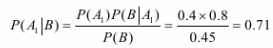 若钥匙已经找到,该钥匙掉在宿舍的概率为多少。 作者:高老师 时间:2024-07-28 浏览 0 钥匙弄丢了,掉在宿舍,教室和路上的概率分别是40%,35%和25%,而掉在上述三处能被找到的概率分别是0.8,0.3,0.1,求:(计算结果近似到小数点后第二位数字)若钥匙已经找到,该钥匙掉在宿舍的概率为多少。【正确答案】:【题目解析】:根据第一问的结果:找到钥匙的概率为0.45,钥匙掉在宿舍且被找到的概率为40%×0.8故P=(40%×0.8)/0.45=0.71 📱 扫码体验刷题小程序 扫一扫使用我们的微信小程序