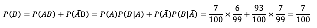 100张彩票中有7张有奖,现有甲先乙后各买了一张彩票,试用计算说明甲、乙两人中奖概率是否相同. 作者:高老师 时间:2024-07-28 浏览 0 100张彩票中有7张有奖,现有甲先乙后各买了一张彩票,试用计算说明甲、乙两人中奖概率是否相同.【正确答案】:【题目解析】:(1)甲先买,100张彩票中有7张有奖,中奖概率为7/100(2)乙买时有两种情况:甲已经中奖,概率为7/100:此时剩余99张彩票,6张有奖,中奖概率为(6/99)甲没有中奖,概率为93/100:此时剩余99张彩票,7张有奖,中奖概率为(7/99)故P=(7/100)×(6/99)+(93/100)×(7/99)=7/100 📱 扫码体验刷题小程序 扫一扫使用我们的微信小程序