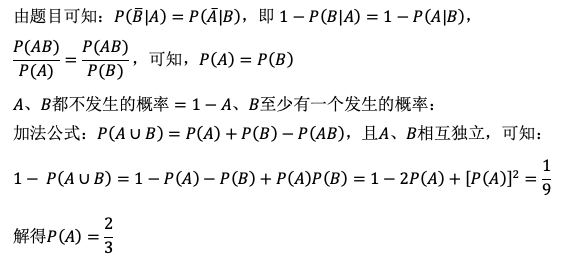 设A,B相互独立且都不发生的概率为1/9,又A发生而B不发生的概率与B发生而A不发生的概率相等,则P(A)=( )。 作者:高老师 时间:2024-07-28 浏览 0 设A,B相互独立且都不发生的概率为1/9,又A发生而B不发生的概率与B发生而A不发生的概率相等,则P(A)=( )。【正确答案】:2/3【题目解析】: 📱 扫码体验刷题小程序 扫一扫使用我们的微信小程序