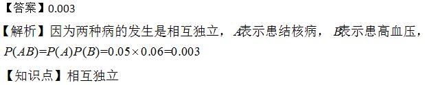 某地区成年人患结核病的概率为0.05,患高血压病的概率为0.06。设这两种病的发生是相互独立的,则该地区内任一成年人同时患有这两 作者:高老师 时间:2024-07-28 浏览 0 某地区成年人患结核病的概率为0.05,患高血压病的概率为0.06。设这两种病的发生是相互独立的,则该地区内任一成年人同时患有这两种病的概率为_________ 。【正确答案】: 📱 扫码体验刷题小程序 扫一扫使用我们的微信小程序